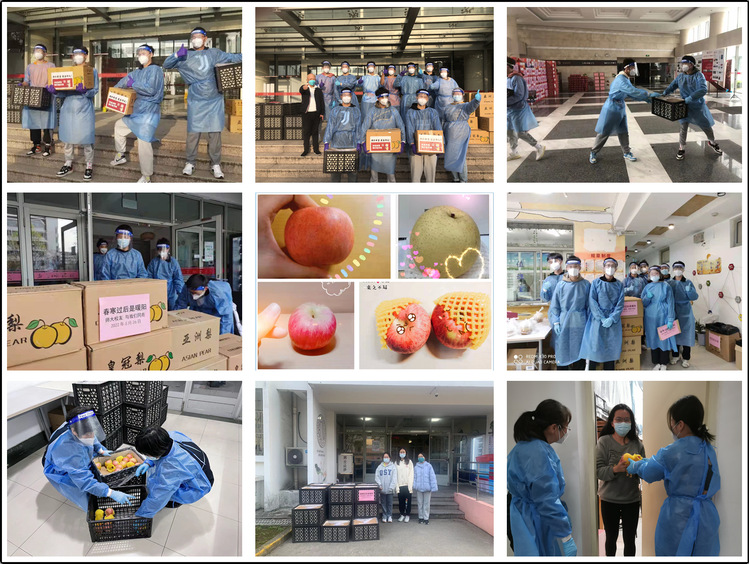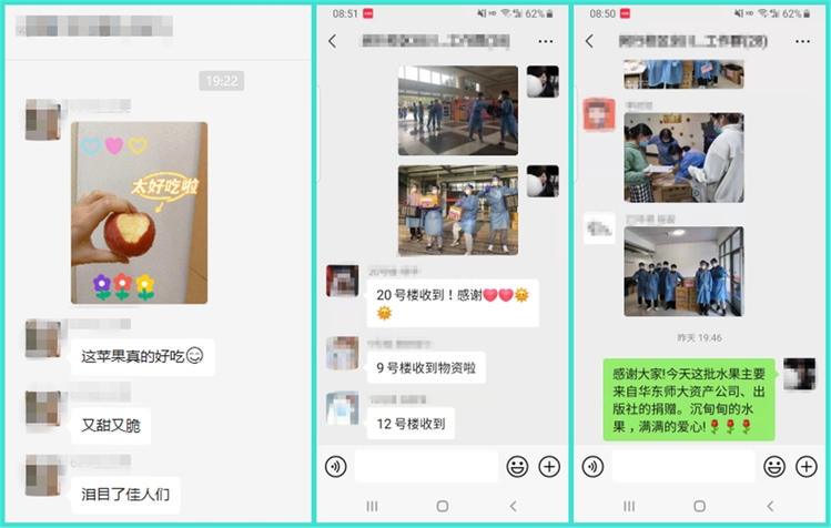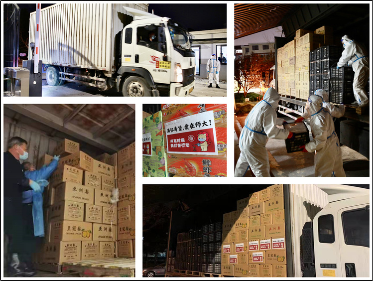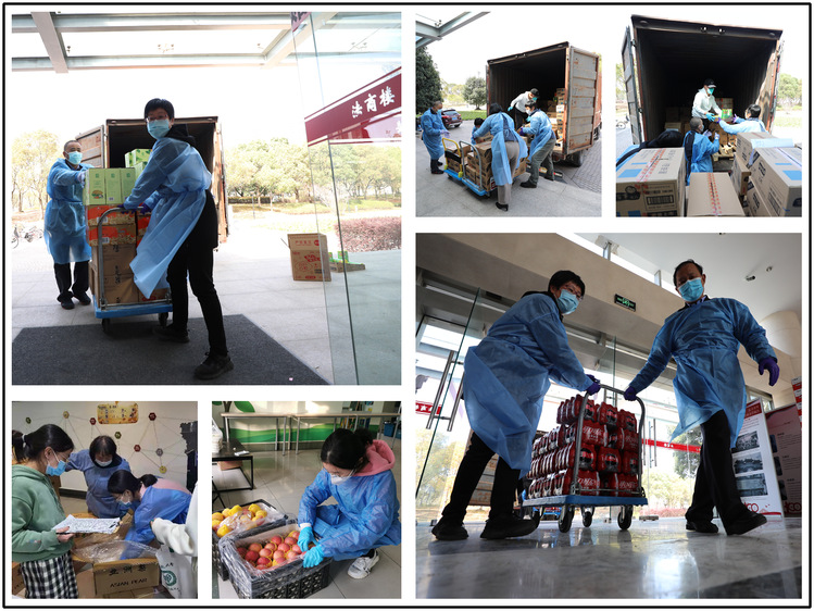 瞧,一场“爱的接力”已拉开序幕,奔忙在校园疫情防控一线的院系书记与志愿者们化身“爱心速递员”,搬的搬、抬的抬,只为将这些水果能够尽快卸货转运送到校内师生的手中。闵行校区的水果卸载转运正值当日大雨,一圈忙完志愿者们早已浑身湿漉。“最后一公里”是世界上最长也是最短的距离,外箱上一句句醒目的“满怀希望,爱在师大”,也于无声中传递着学校企业全体干部职工对全校师生及一线防疫工作者的挂念与鼓励。