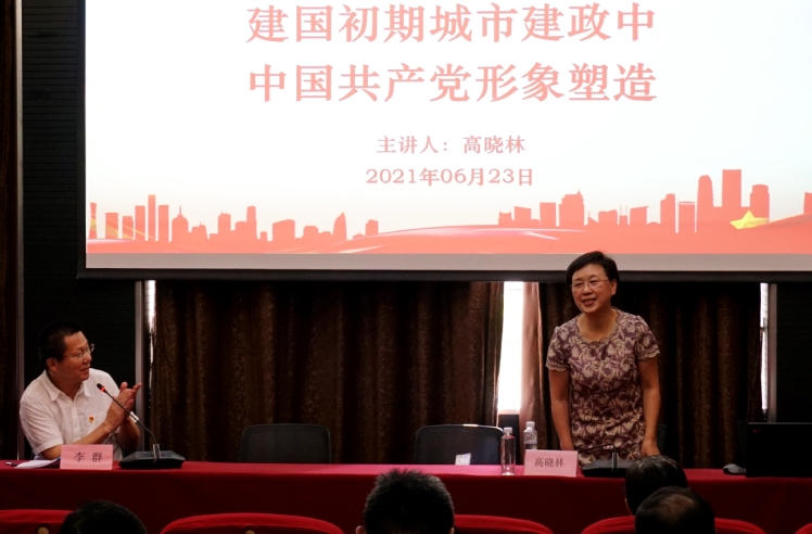 本次会议还邀请到市教卫党史宣讲团专家、复旦大学马克思主义学院高晓林教授作题为“建国初期城市建政中中国共产党形象塑造”的辅导报告。报告指出,中国共产党始终高度重视形象建设。建国初期是中国共产党面临着政党转型、国家转型和社会转型的变局,在城市建政和国民经济恢复,社会主义改造的过程中,政党、国家和社会经历翻天覆地巨大历史变迁。高晓林教授以丰富的史实说明中国共产党在建国初期,如何在政治、经济、文化、社会、外交等各方面重建与改造中塑造自身形象,为全体与会人员带来一堂精彩的党史学习教育专题党课。