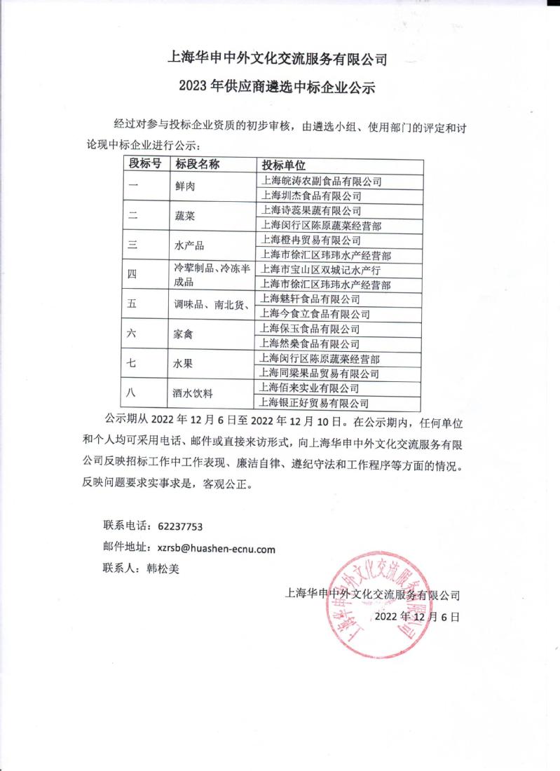 上海华申中外文化交流服务有限公司2023年供应商遴选中标企业公示